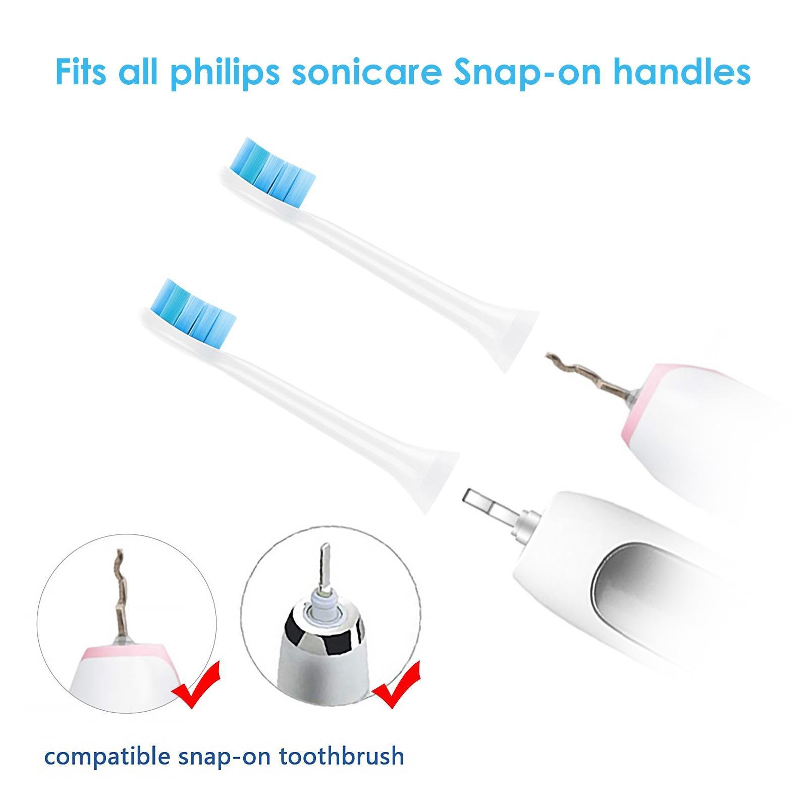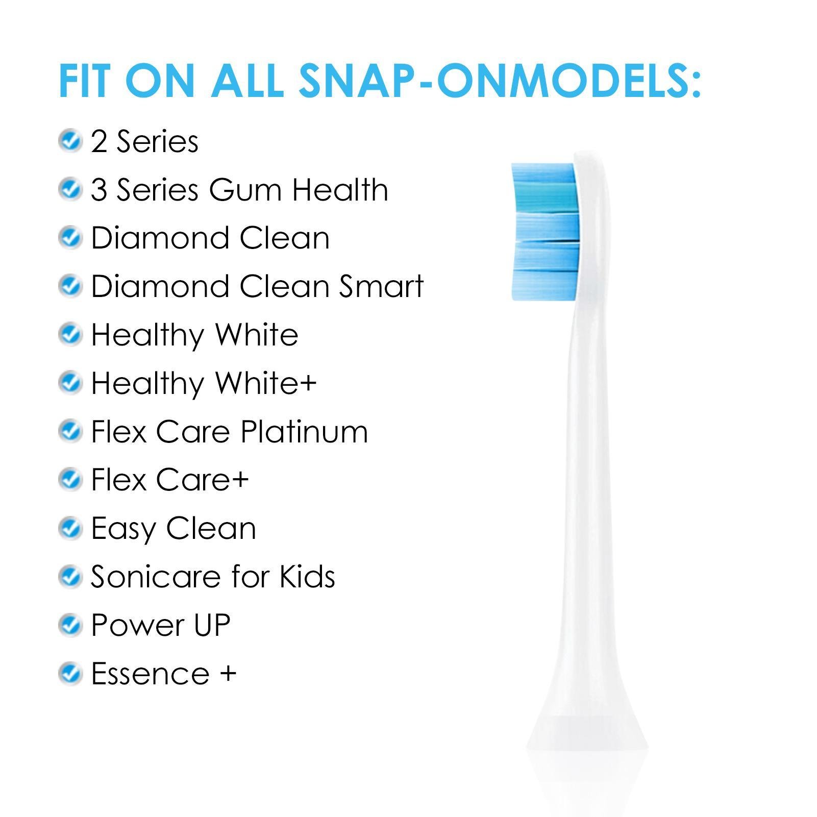 [Perfectly Fits All Click-on Handles with No Noisy]: Toptheway replacement brush heads for philips sonicare toothbrush heads are fit perfectly with Sonic care 2 Series Plaque Control; Sonicare 3 Series Gum Health; DiamondClean; EasyClean; Essence+; FlexCare+; FlexCare Platinum; HealthyWhite and HydroClean all snap-on brush handles. And the specially 304 metal ring can really reduce the noise; u can buy without worry.